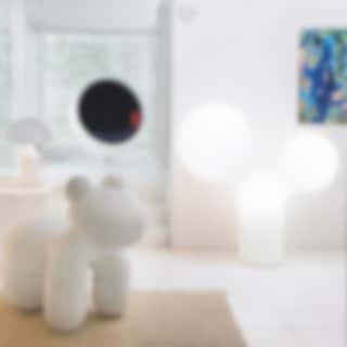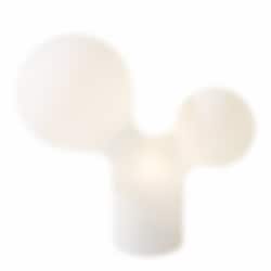 Double Bubble har redan blivit en klassiker och finns i två storlekar, för bord och en monumental golvlampa. Tre ljuskällor är placerade inuti lampan, en i varje bubbla och en i foten.