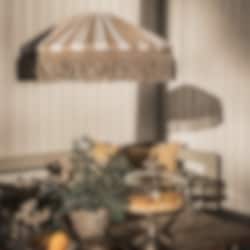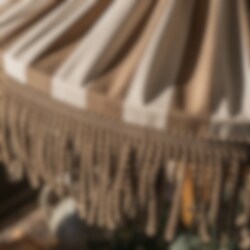 Skärmtyget och fransen är tillverkade i material av högsta kvalitet, speciellt utvalda för att klara det nordiska sommarvädret. De är vattenavvisande, UV-beständiga och har utmärkt färgbeständighet - vilket innebär att de behåller sin färg och form även i starkt solljus.