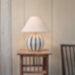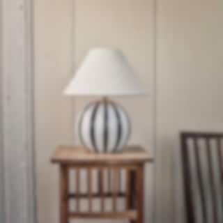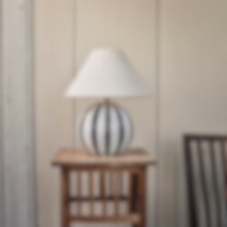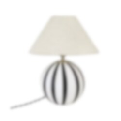 Elegant bordslampa med en vacker rund fot med svarta ränder med en vit bas och beige lampskärm. Denna tidlösa design är perfekt för att ge ditt rum en klassisk och sofistikerad touch.