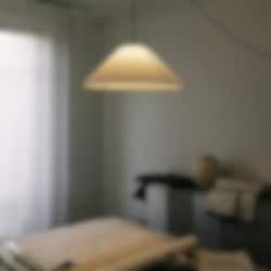 yta med en pappersliknande känsla. Den subtila strukturen bryts av med en kontrasterande textilkant som förstärker lampans distinkta karaktär.