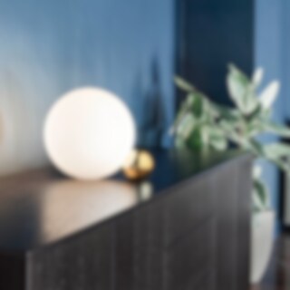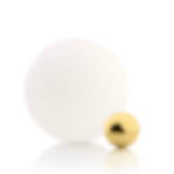 En kollektion lampor formgivna av Michael Anastassiades. Två sfärer som bara nuddar varandra, en liten i pläterad 24 karats guld, i skuggan av den stora, i blåst glas.