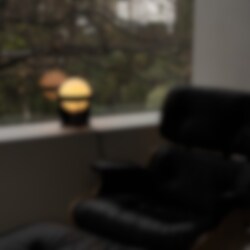 Anodiserad för att uppnå sin distinkta färgfinish, är Loop-bordslampan ihopkopplad med Talas Sphere IV LED-lampa. Ljuskällans Dim to Warm-egenskaper och månliknande form accentuerar Loops eteriska kraft.
