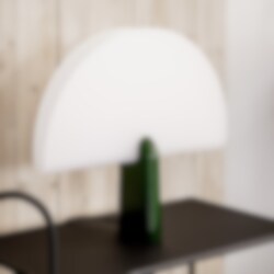 Pavo grön är en bordslampa i ett smalare format som gör den utmärkt att placera i ett fönster eller liknande mindre avsatser. Lampan består av en bas i massiv aluminium och en skärm av återvunnen polymer. Kombinationen mellan den ljusa halvcirkelformade skärmen och den massiva basen skapar en spännande kontrast i form och färg och ger rummet en vacker silhuett. Ljuskällan som ger ett varmt sken har finjusterats för att skapa en optimal ljusspridning kvällstid. På dagen fångar den mjölkvita lampskärmen dagsljuset och fungerar som ett vackert objekt på egen hand.