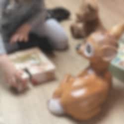 Superfin Rådjurslampa till barnrummet! Traditionellt tillverkad och handmålad med giftfri färg från HEICO-fabriken i Tyskland (nu Egmont Toys). Förgyller barnrummet på ett klassiskt och tidlöst vis och ger ett mjukt och behagligt ljus i rummet som hjälper de små att somna gott på kvällen. Upplyst eller inte - det lilla rådjuret är alltid ett trevligt och dekorativt objekt i barnrummet.
