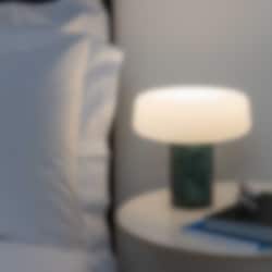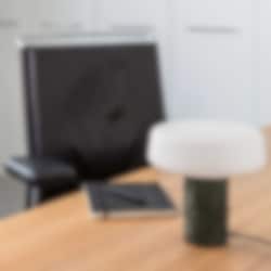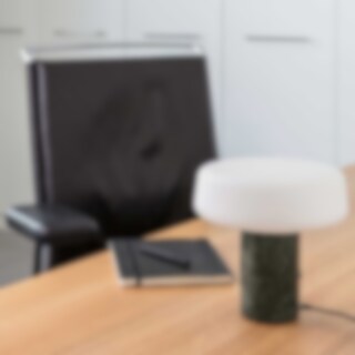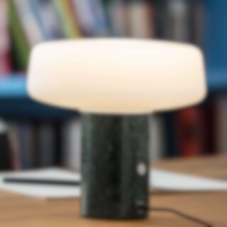 Solid Light Small bordslampan har en mycket vackert cylindris bas, framställd av massiv Serpentine marmor. Det vita glaset sörjer för ett underbart diffust ljus, och den cylindriska gröna basen ger lampan en unik charm. Den är utrustad med en integrerad dimmer i stål, på den cylindriska bas, och skärmen är matterat handblåst opalglas. Marmor är naturmaterial därför kan varianterna variera en aning, vilket gör varje lampa unik.