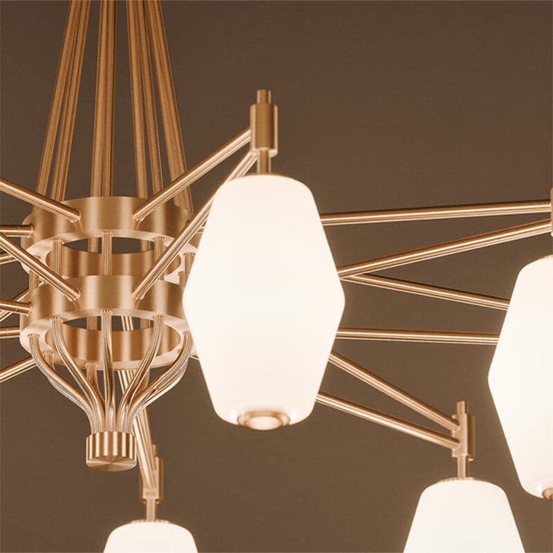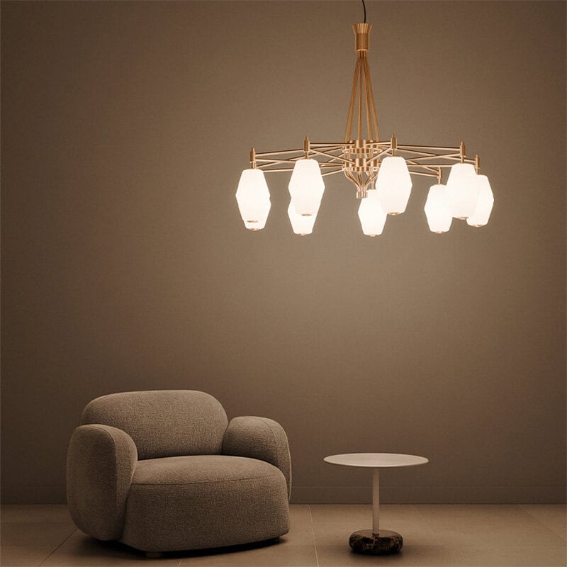 Den återlanserade takkronan är trogen originalets mid-century-karaktär men anpassad för dagens hem. Munblåsta glaskupor sprider ett mjukt och behagligt ljus i rummet, medan detaljer i mässing tillför en sofistikerad elegans. Proportionerna är varsamt justerade för att fungera väl även i moderna takhöjder, vilket gör designen lika funktionell som ikonisk.