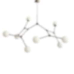 Designen definieras av de rena, sfäriska formerna som kontrasterar vackert mot den slanka, minimalistiska metallstommen. Med inspiration från Art Decos pampiga ljuskronor har Drop Chandelier Bulb förenklat uttrycket och skalat bort det ornamentala till förmån för rena linjer och välbalanserade proportioner. Resultatet är en tidlös men samtidigt modern armatur, där enkelheten förstärker elegansen.