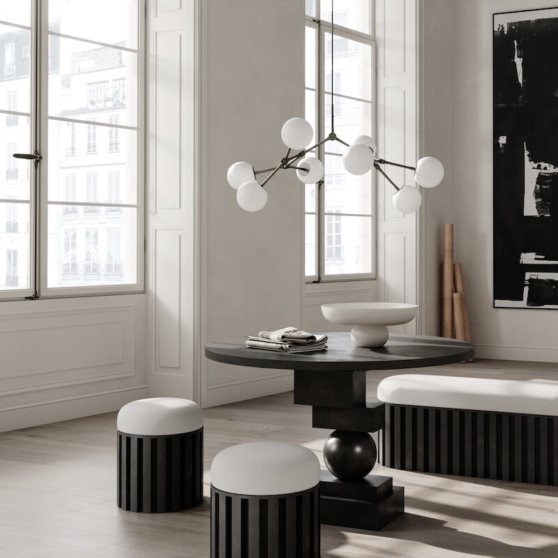 Designen definieras av de rena, sfäriska formerna som kontrasterar vackert mot den slanka, minimalistiska metallstommen. Med inspiration från Art Decos pampiga ljuskronor har Drop Chandelier Bulb förenklat uttrycket och skalat bort det ornamentala till förmån för rena linjer och välbalanserade proportioner. Resultatet är en tidlös men samtidigt modern armatur, där enkelheten förstärker elegansen.