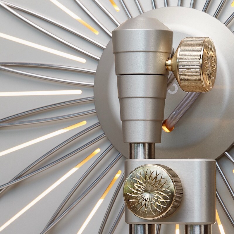 Materialval som mässing, rostfritt stål, aluminium och transparent polymer förstärker känslan av precision och lätthet, medan den justerbara höjden och dimbara funktionen gör lampan flexibel i användning.