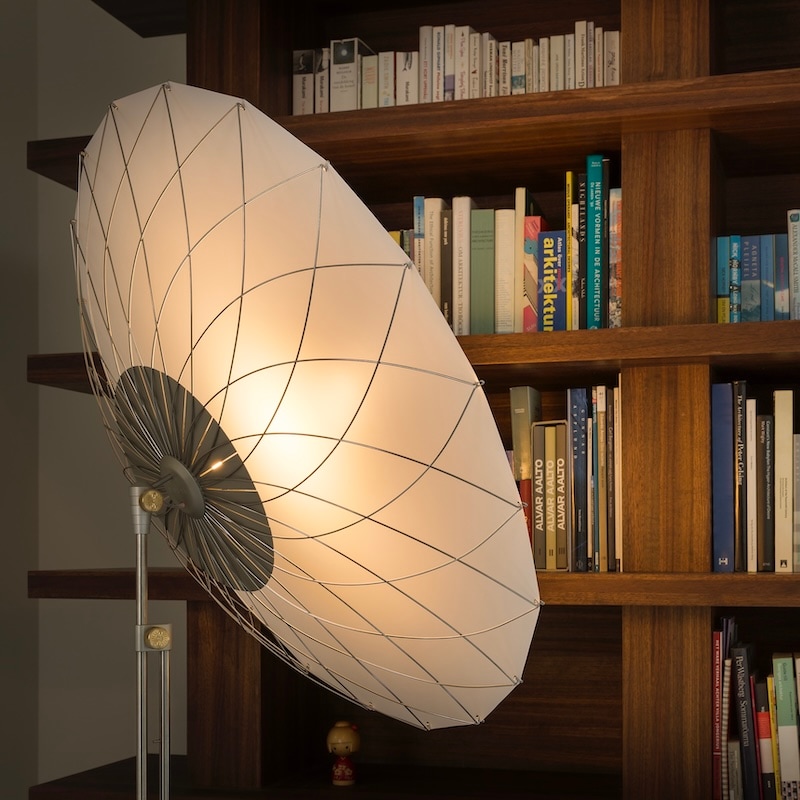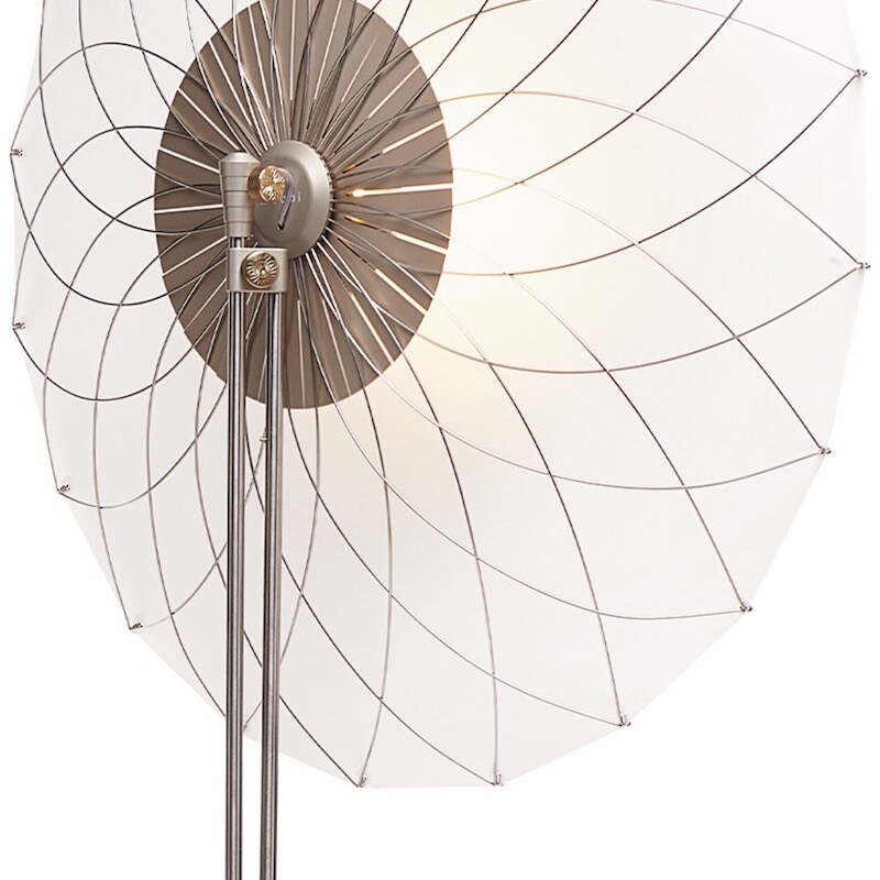 Lampans karaktäristiska uttryck skapas av ett finmaskigt nät av tunna metalltrådar som håller en transparent skärm i spänd position. Strukturen för tankarna till filigransmycken och ger lampan ett luftigt, nästan svävande intryck trots dess generösa storlek.