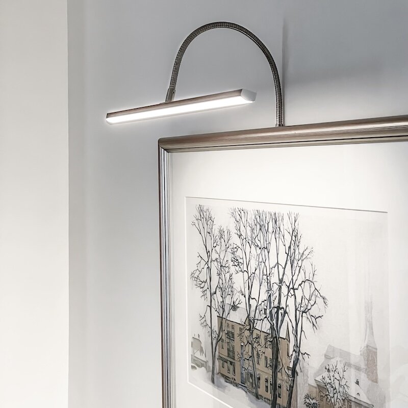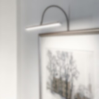 Lys upp dina konstverk, familjefoton eller vackra föremål i bokhyllan, med Miro dimbar tavelbelysning. Lampan kan monteras på väggen, direkt på en tavelram eller ovanpå en hylla eller ett skåp. Miro har integrerad LED som du enkelt kan justera med dimmerbrytaren som sitter lättåtkomligt på sladden, ca 120 cm från väggfästet.