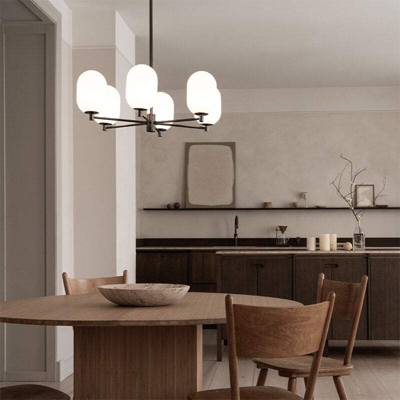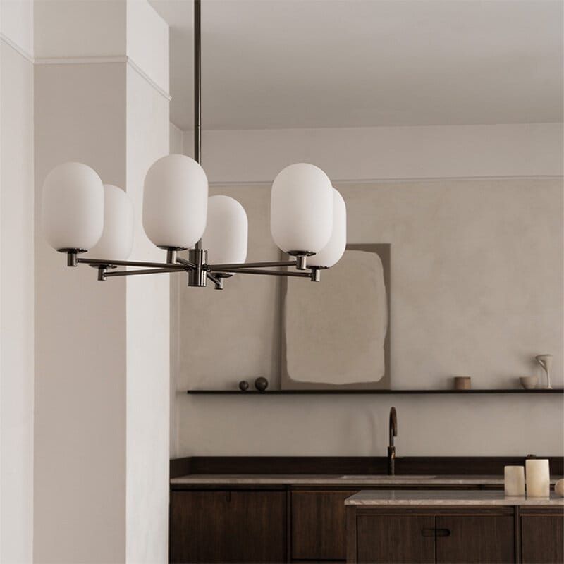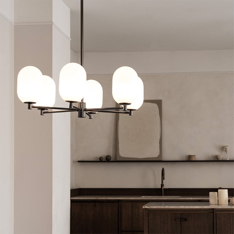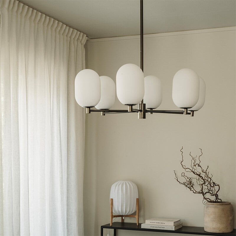 Noor Chandelier är en stilren takkrona med sex glober i munblåst opalglas och detaljer i svart krom. Den kombinerar modern elegans med tidlös design och skapar ett mjukt, inbjudande ljus som förhöjer atmosfären i rummet.