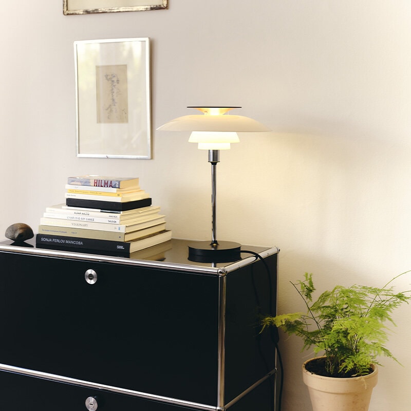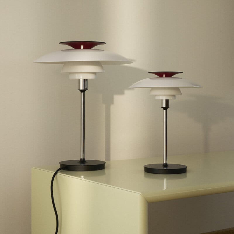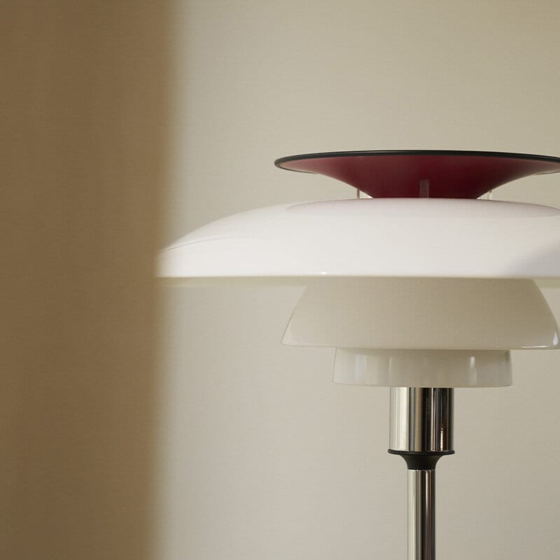 Design: Poul Henningsen, 1974.PH 80 är en del av den välkända PH-serien och bygger på det klassiska treskärmssystemet som ger ett behagligt och bländfritt ljus. Lampans konstruktion med flera skärmar sprider ljuset mjukt och indirekt, vilket skapar en varm och inbjudande atmosfär i rummet. Bordslampan kombinerar funktion med estetik och fungerar lika bra i privata hem som i professionella miljöer, där den tillför både karaktär och stämningsfull belysning.