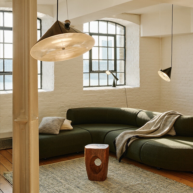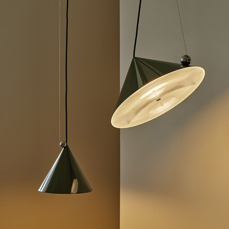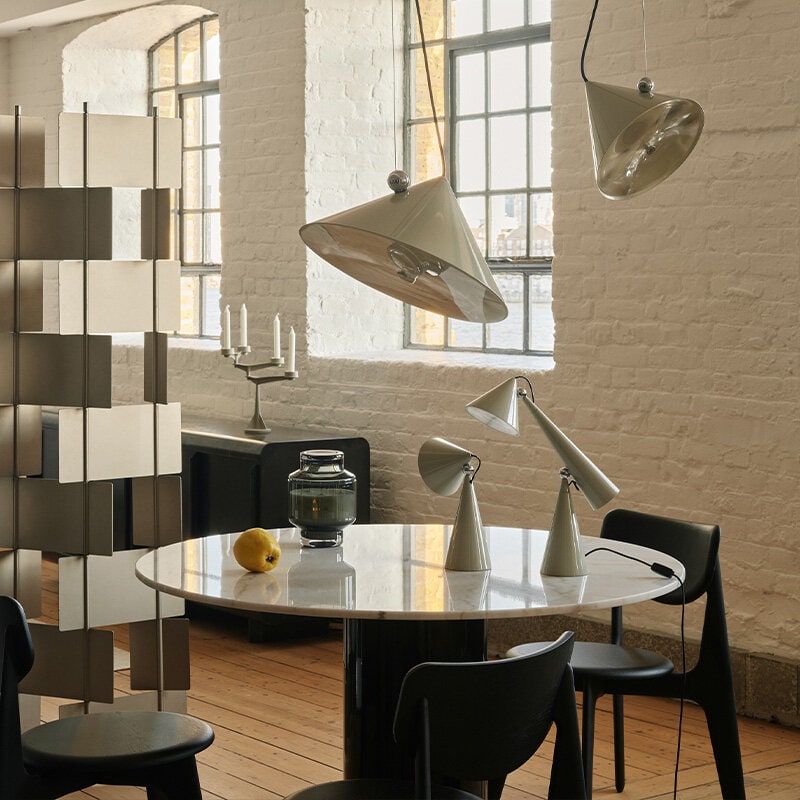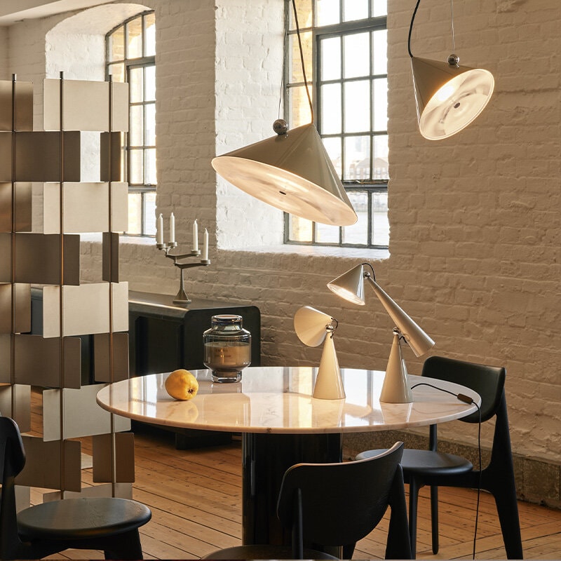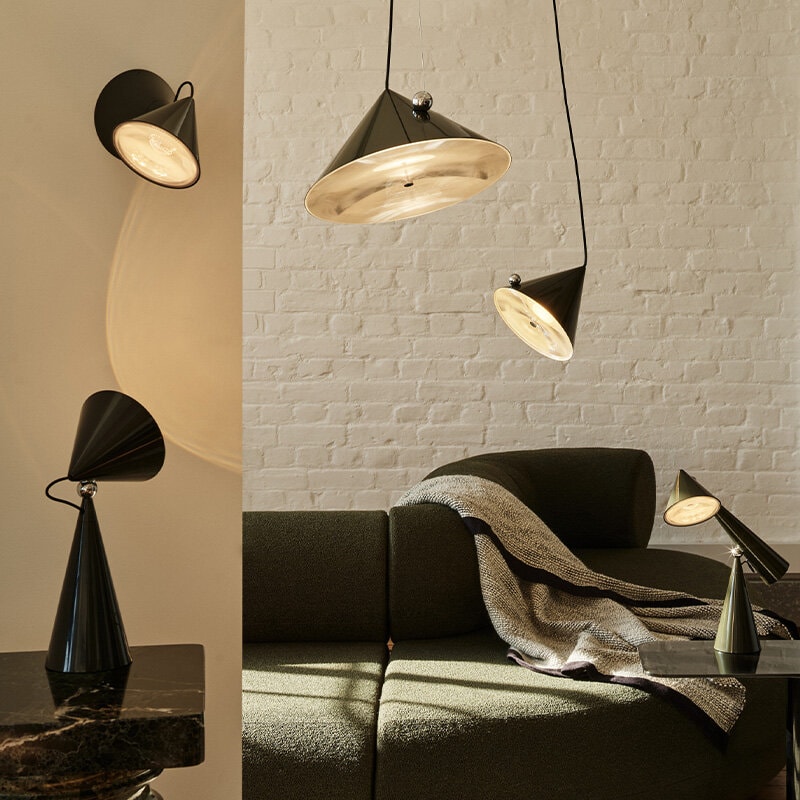 - Beat: Beat-serien, inspirerad av traditionella indiska vattenkärl, är tillverkad i handslagen mässing. Med sin mattsvarta utsida och mässingsfärgade insida sprider lampan ett varmt, rikt ljus och har blivit en modern klassiker i både privata och offentliga miljöer.
