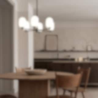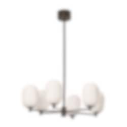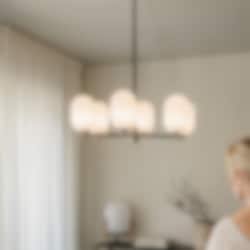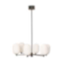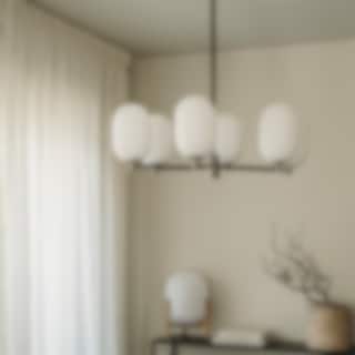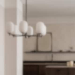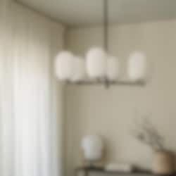 Noor Chandelier är en stilren takkrona med sex glober i munblåst opalglas och detaljer i svart krom. Den kombinerar modern elegans med tidlös design och skapar ett mjukt, inbjudande ljus som förhöjer atmosfären i rummet.