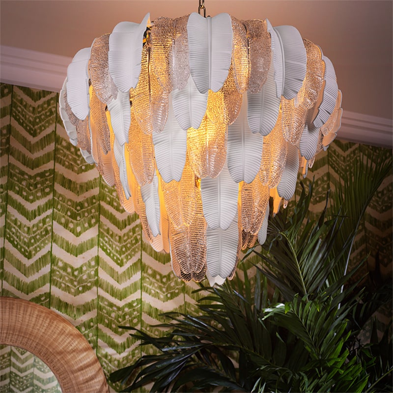 Saint Lucia L Taklampa från Eichholtz är inspirerad av den graciösa formen hos ett bananträd och förenar keramik och texturerat glas i en harmonisk kombination som utstrålar naturlig skönhet och konstnärlig elegans.