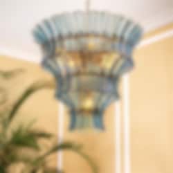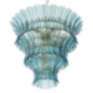 Toscano Taklampa från Eichholtz är en exklusiv ljuskrona i handblåst blått glas, där varje detalj vittnar om gediget hantverk och tidlös elegans. Den antikmässingsfärgade ramen ger en varm kontrast till glasets klara ton och sprider ett mjukt, rogivande sken i rummet.