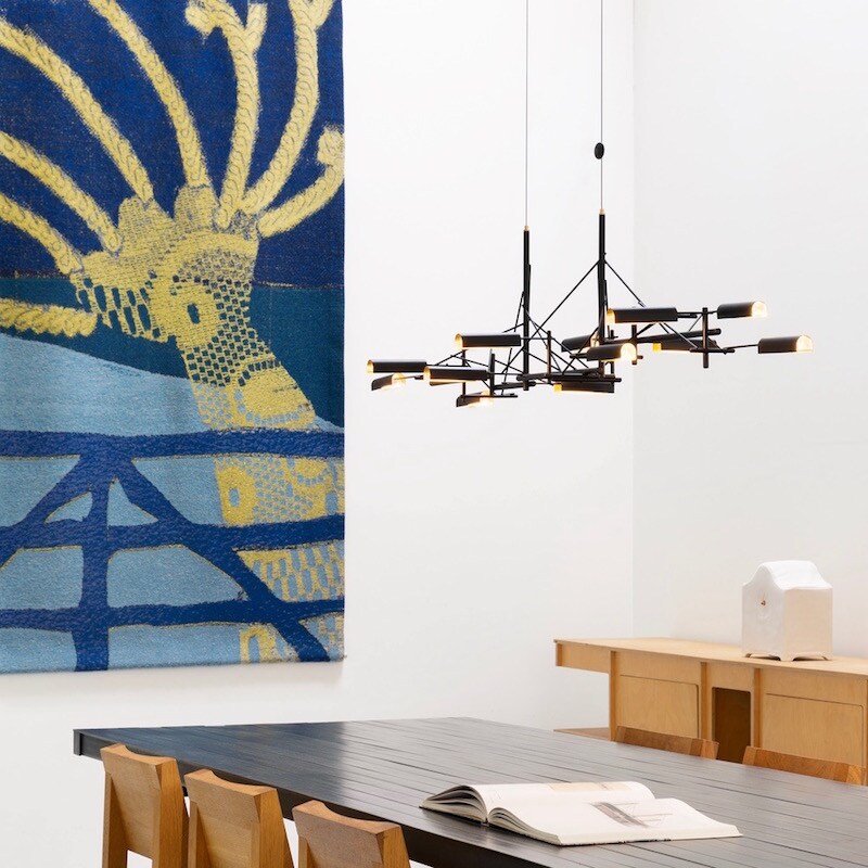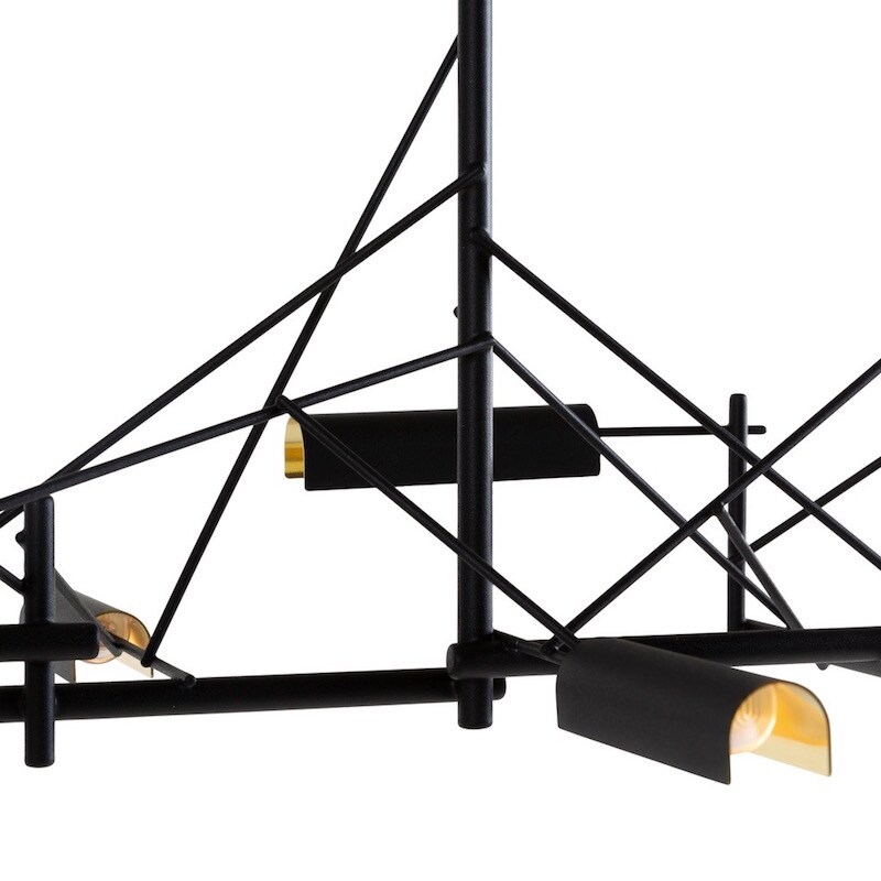 Den svarta metallstrukturen kontrasteras av detaljer i mässing, vilket ger en varm och exklusiv karaktär. De individuellt justerbara ljuskällorna gör det möjligt att rikta ljuset efter behov och skapa varierade ljusmiljöer – från funktionell arbetsbelysning till en mjukare, mer stämningsfull atmosfär.