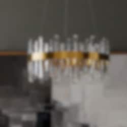 Taklampa Triumph är en exklusiv och elegant lampa med modern design som gör den till ett riktigt blickfång. Lampan är dekorerad med glasstavar i tre olika storlekar, vilket skapar en levande och dynamisk känsla i rummet. Kombinationen av glasstavarna och de eleganta mässingsdetaljerna ger en vacker kontrast som förstärker lampans lyxiga uttryck.
