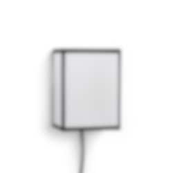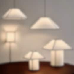 yta med en pappersliknande känsla. Den subtila strukturen bryts av med en kontrasterande textilkant som förstärker lampans distinkta karaktär.