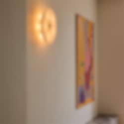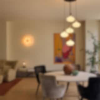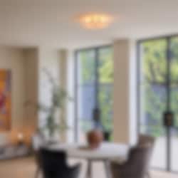 Bakom den 425 mm stora glasdisken sprids ljuset mjukt och skapar en subtil, atmosfärisk belysning som passar perfekt i gångar, hallområden och andra liminala utrymmen. Magma Flush Mount kombinerar hållbar design, modern estetik och funktionell belysning, vilket gör den till ett iögonfallande tillskott i både hem och offentliga miljöer.