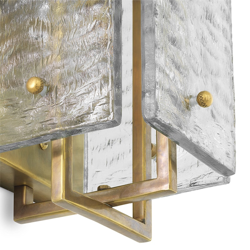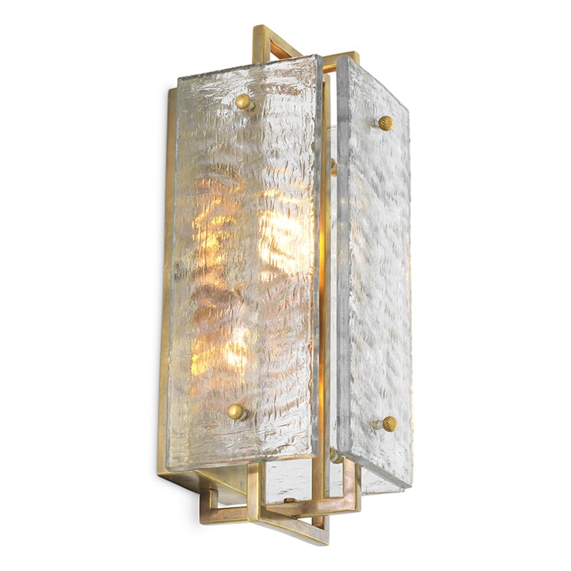 Solara Vägglampa från Eichholtz är en sofistikerad och elegant belysningsdetalj som lyfter din inredning med tidlös stil. Den har en vintage mässingsram omgiven av rektangulära paneler i handgjort glas, vilket skapar en modern och stilren kontrast mellan metall och glas.