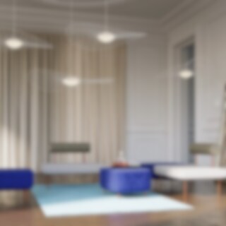 Lampan är en svävande, eterisk och grafisk lampa. Den anpassar sig till både små och stora utrymmen utan att blockera utsikten. Tillverkad i glasfiber som gör lampan väldigt lätt och följer luftens mjuka rörelser som den omges av.