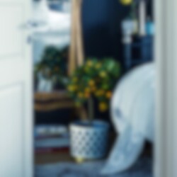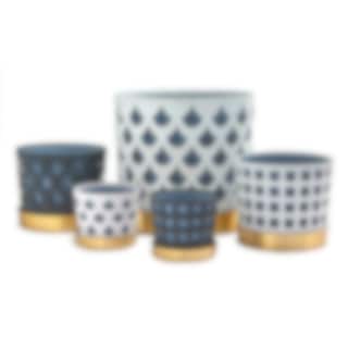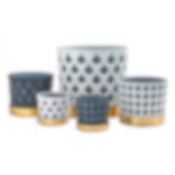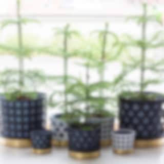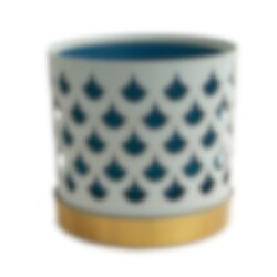 Trio Pot består av tre separata delar. Den inre krukan har en fantastisk matt blå färg som ger ett djup åt den vita mönstrade krukan. Står på ett fat av mässing som ger en elegant känsla. En mångsidig design som passar de flesta hem.