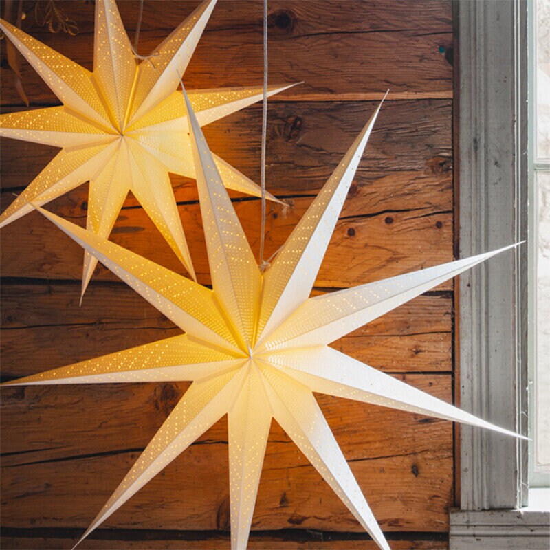 Alicia D90 vit är en klassisk julstjärna i papper, handvikt av skickliga hantverkare för att ge varje exemplar ett unikt uttryck. Den slimmade designen och det dekorativa hålmönstret sprider ett varmt och stämningsfullt ljus som skapar en genuin julstämning i hela rummet.
