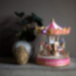 Denna traditionella rosa karusell ger din julby en autentisk tivolikänsla. Med noggrant utformade figurer, stämningsfull belysning och musik (8 olika låtar) skapar den en varm och magisk atmosfär. Karusellen har en praktisk 6-timmars timer och kan drivas med batterier eller via USB, vilket gör den enkel att placera var som helst. En charmig och lekfull detalj som blir en favorit för både barn och vuxna under hela julen.