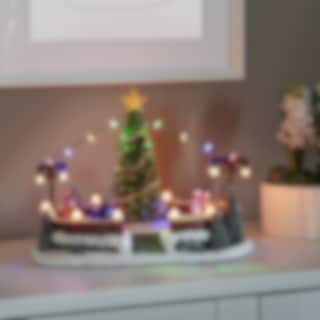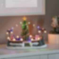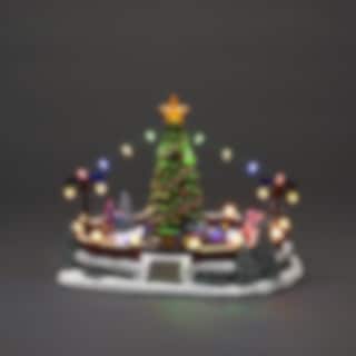 En mekanisk juldekoration i form av en lekplats med flerfärgad LED-belysning och julmusik.