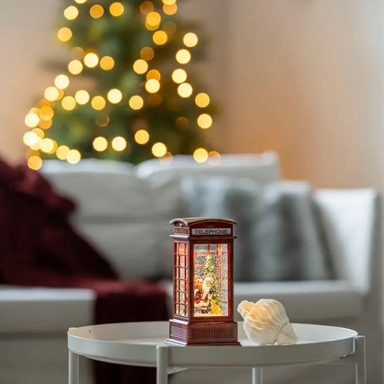 Denna lekfulla juldekoration föreställer en tomte i en klassisk telefonkiosk, fylld med vatten och detaljrika figurer. När glittret virvlar runt skapas en magisk snöglobskänsla som sprider värme och julstämning i rummet. Den varmvita LED-belysningen ger ett mjukt, inbjudande sken, och med den inbyggda 5-timmarstimerfunktionen kan dekorationen lysa upp hemmet utan att behöva släckas manuellt. Drivs med 3xAA-batterier (ingår ej).