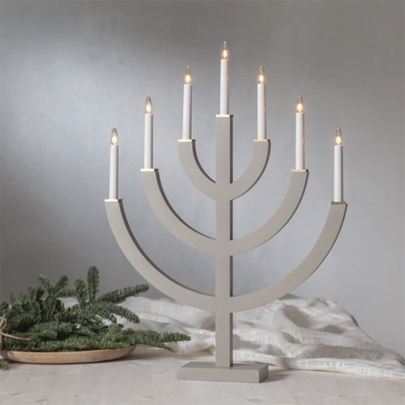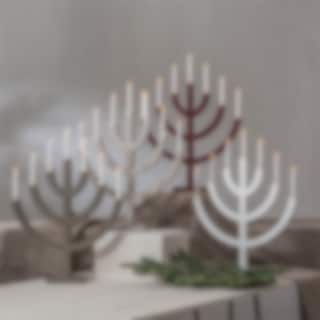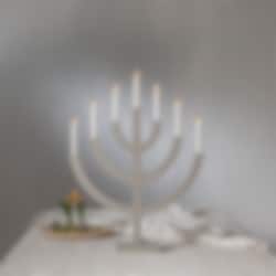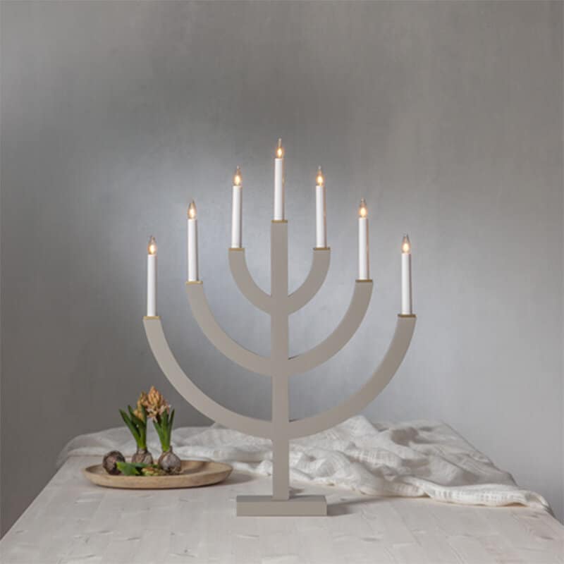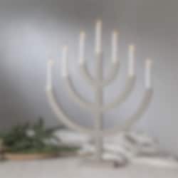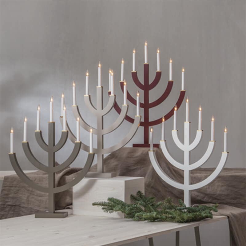 Stämningsfull vit adventsljusstake tillverkad i trä med målade träbrickor i guld som dekoration. Ljusstaken är både moderna och traditionell och passar utmärkt i ett fönster eller på en skänk. Julen blir någt alldeles extra med stämningsfulla Anno som dekoration.
