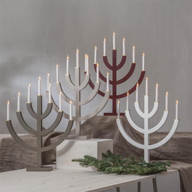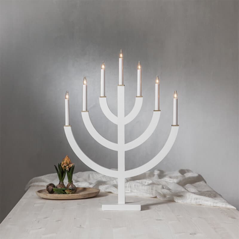 Stämningsfull vit adventsljusstake tillverkad i trä med målade träbrickor i guld som dekoration. Ljusstaken är både moderna och traditionell och passar utmärkt i ett fönster eller på en skänk. Julen blir någt alldeles extra med stämningsfulla Anno som dekoration.