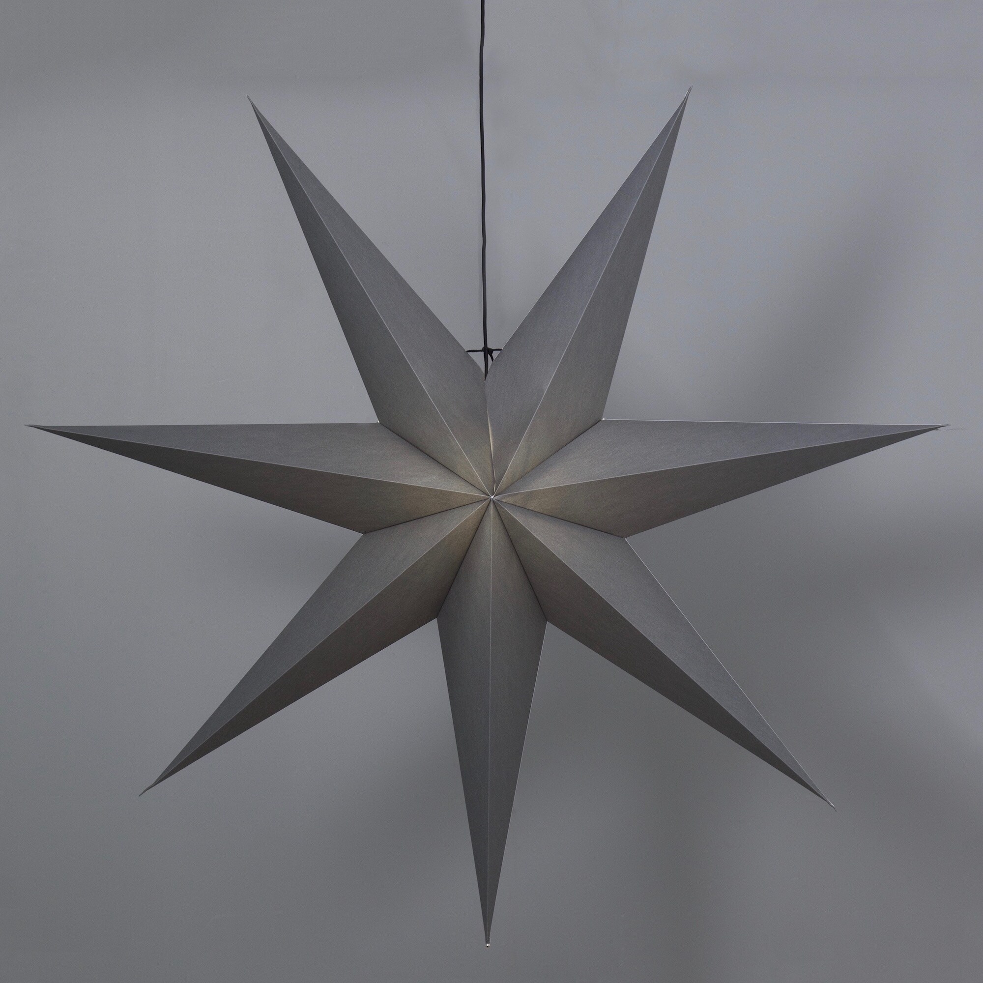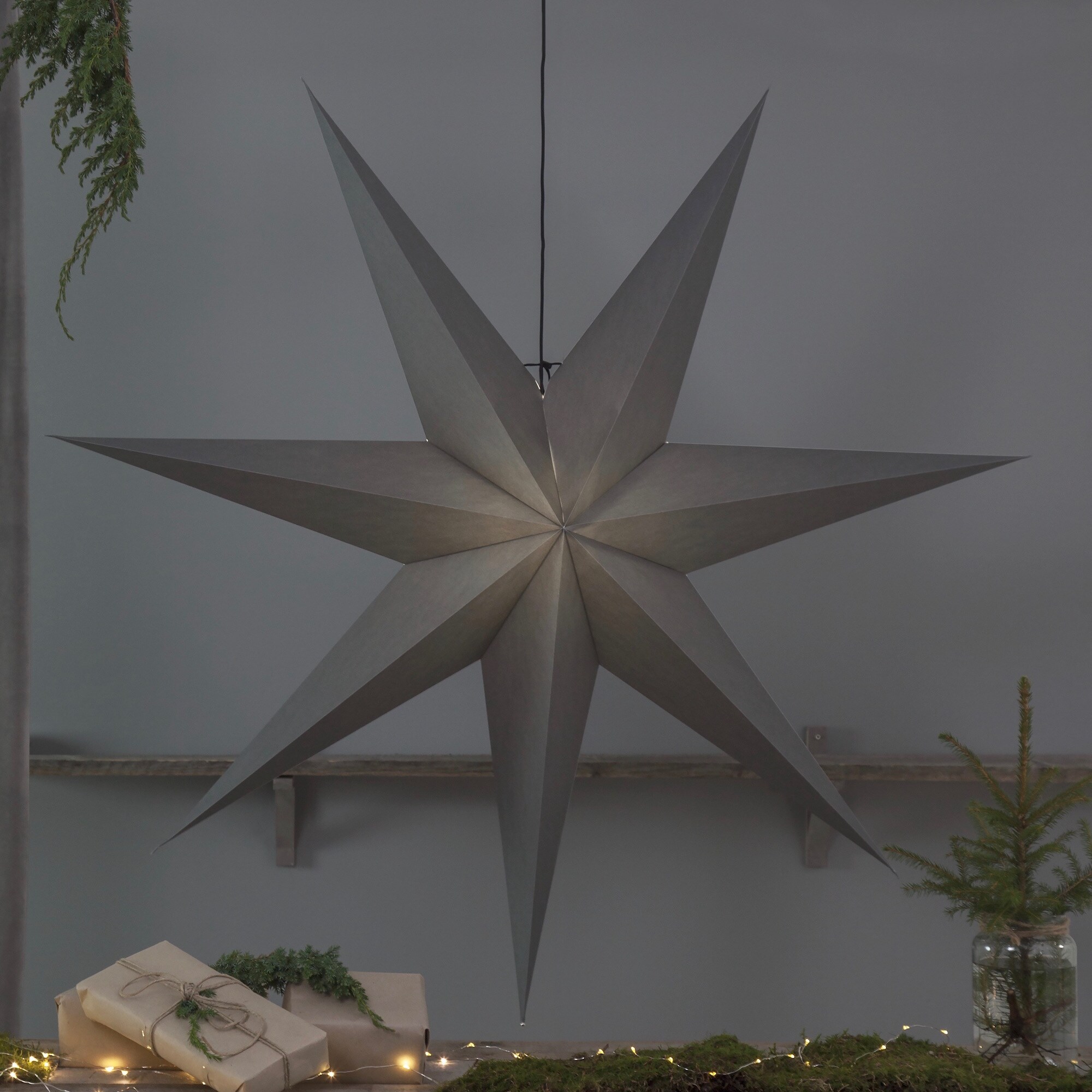 En stilren stjärna i grå papp som skapar julstämning och ger ett fint varmt sken. Den har svart textil upphäng med stickkontakt för vägguttag. Fin i hemmets alla rum.