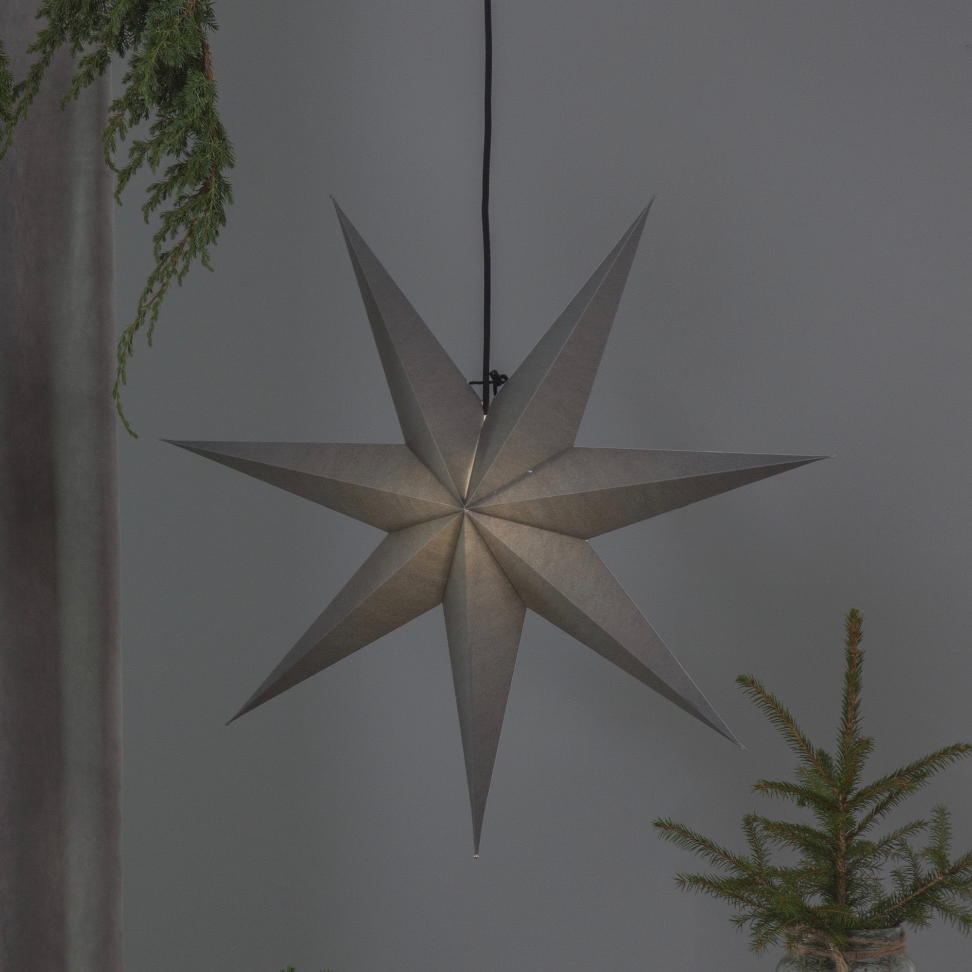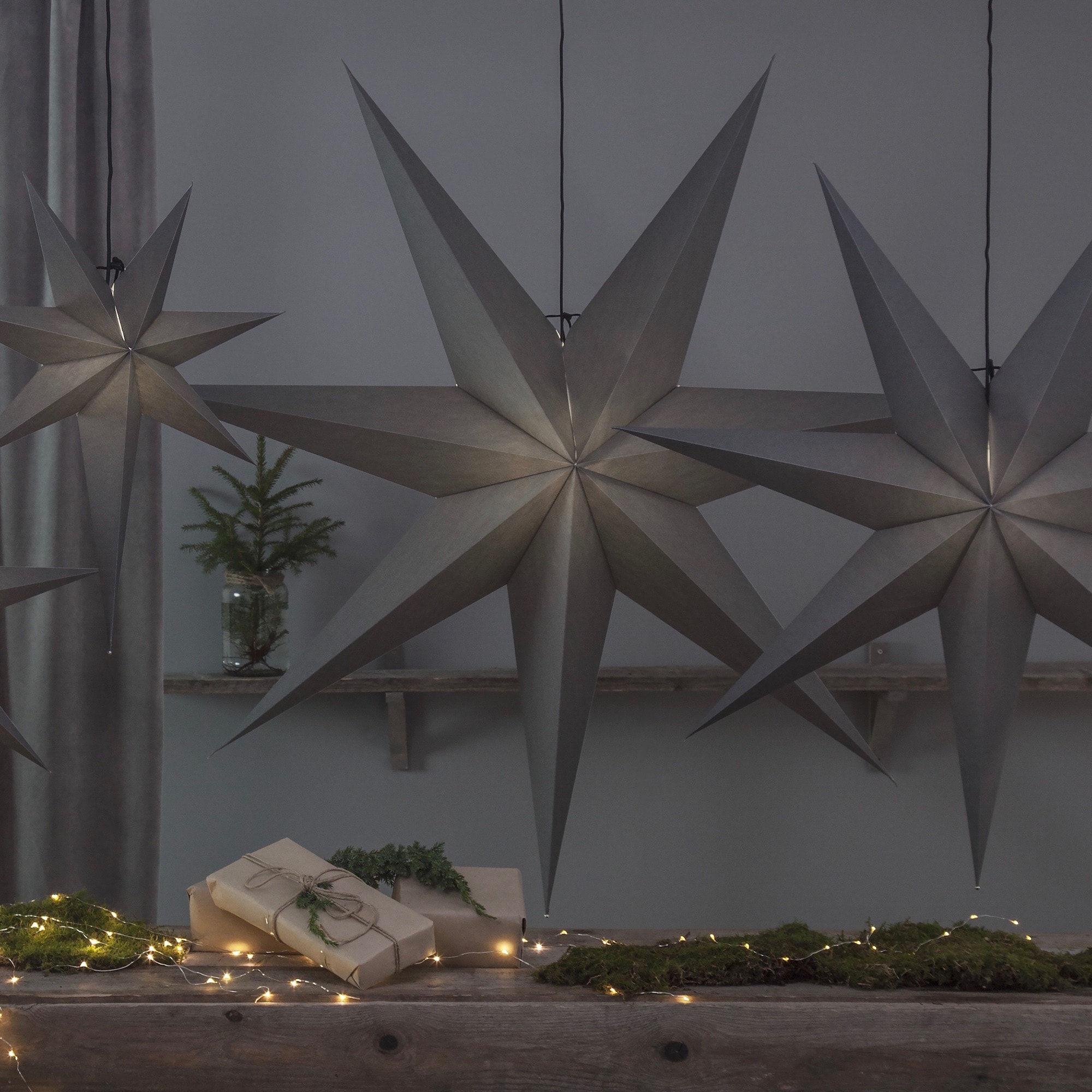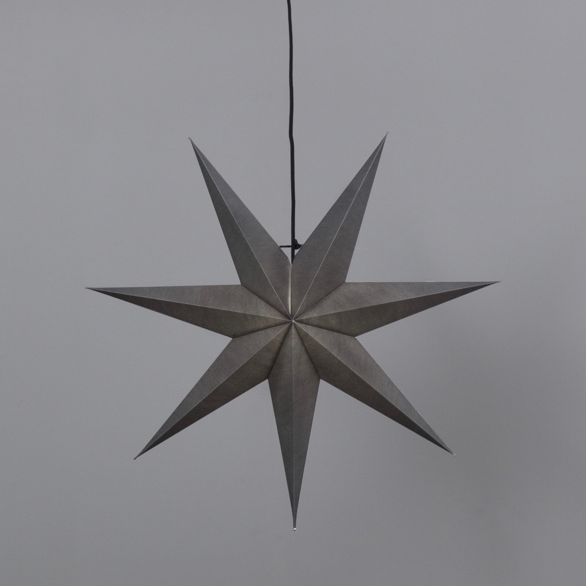 En stilren stjärna i grå papp som skapar julstämning och ger ett fint varmt sken. Den har svart textil upphäng med stickkontakt för vägguttag. Fin i hemmets alla rum.