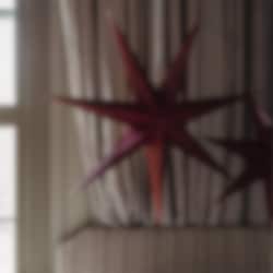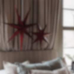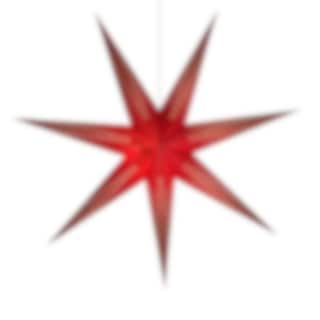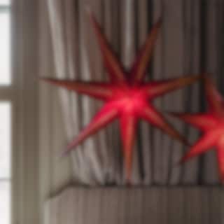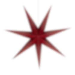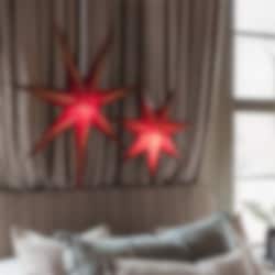 Evelina pappstjärna har en djup mörkröd färg med vit insida, vilket gör att det vackra hålmönstret framträder tydligt när stjärnan tänds.