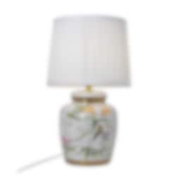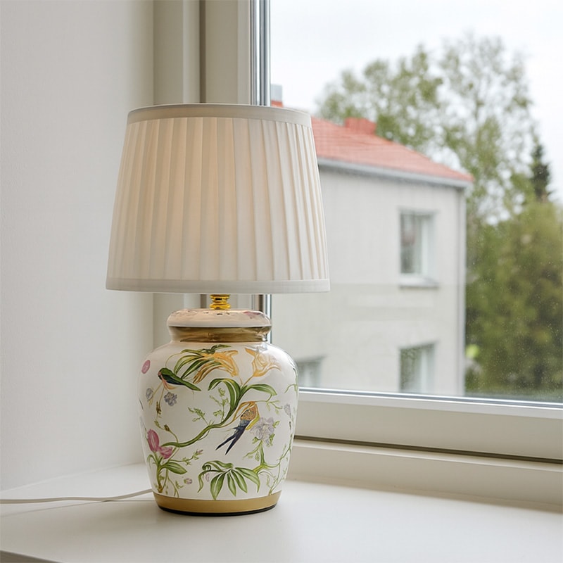 Den vita textilskärmen ger ett mjukt och behagligt ljus som passar perfekt i fönstret, på ett sidobord eller nattduksbord. Tack vare sin kompakta storlek är lampan enkel att placera och fungerar lika fint ensam som i par.