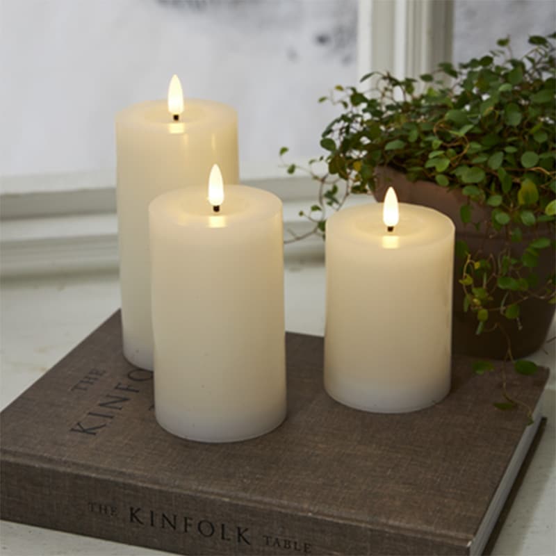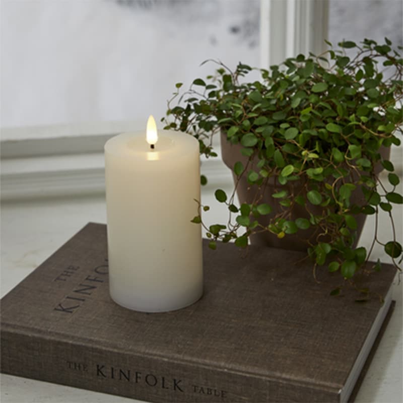 Flamme Flow är ett blockljus med vår naturtrogna låga Flamme med en brinntid på cirka 1500 timmar. Detta stearinljus har en blank nedsänkning under lågan, denna yta ser ut som flytande vax vilket gör ljuset än mer naturtroget. Ljuset är cirka 7,5cm i diameter och höjden 12,5cm för vax delen och cirka 15cm med lågan. Detta ledljus blir en vacker dekoration, både ensam och i grupp ihop med övriga ljus från vår Flamme serie. Den har timerfunktion och när brytaren är på timerläget lyser ljuset i ca 250 dagar med en vacker realistisk låga i varmvitt. Den drivs av 2 AA batterier, dessa ingår ej.
