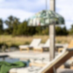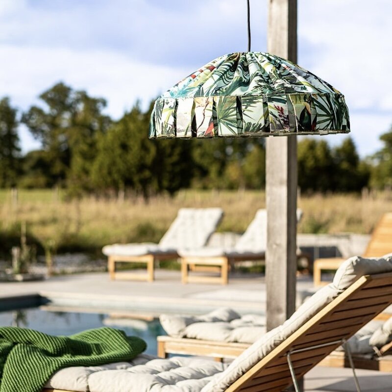 Taklampan "Ray" skapar en inbjudande atmosfär på uteplatsen. Lampan är tillverkad av väderbeständiga material där både tyg och frans är vattenavvisande, UV-beständiga och har en hög färgfasthet vilket betyder att de står emot blekning av starkt solljus. Lampan är slitstark och har lång livslängd. Den 5 m långa gummikabeln med medföljande ögla på, gör placering och upphängning enkel och flexibel.