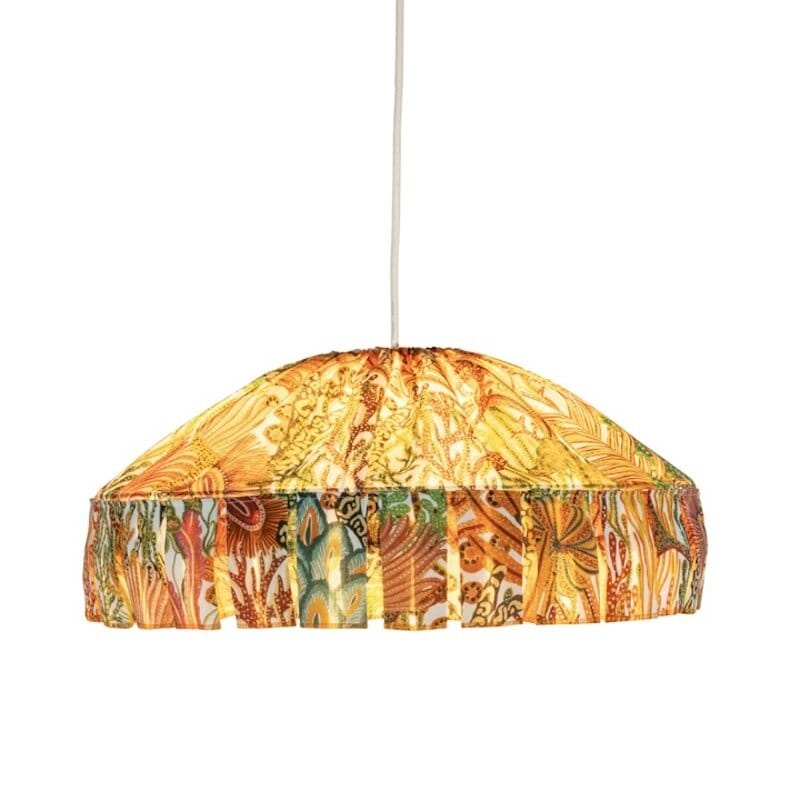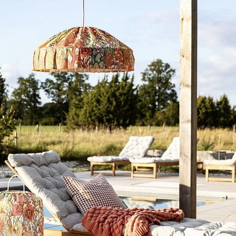 Taklampan "Ray" skapar en inbjudande atmosfär på uteplatsen. Lampan är tillverkad av väderbeständiga material där både tyg och frans är vattenavvisande, UV-beständiga och har en hög färgfasthet vilket betyder att de står emot blekning av starkt solljus. Lampan är slitstark och har lång livslängd. Den 5 m långa gummikabeln med medföljande ögla på, gör placering och upphängning enkel och flexibel.