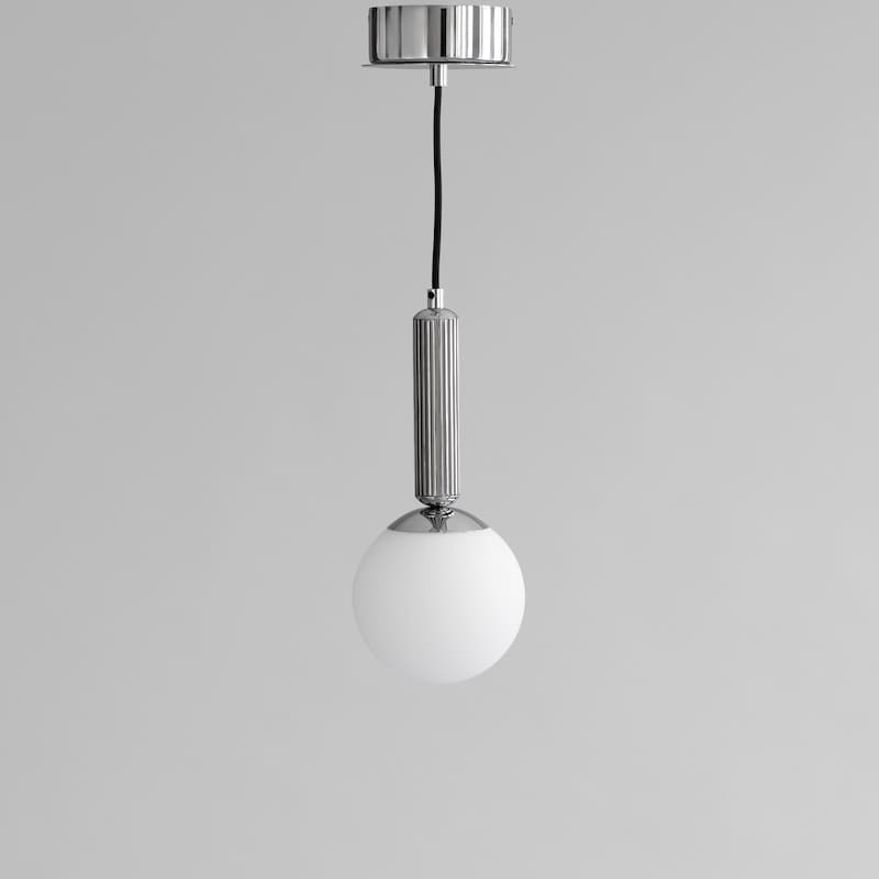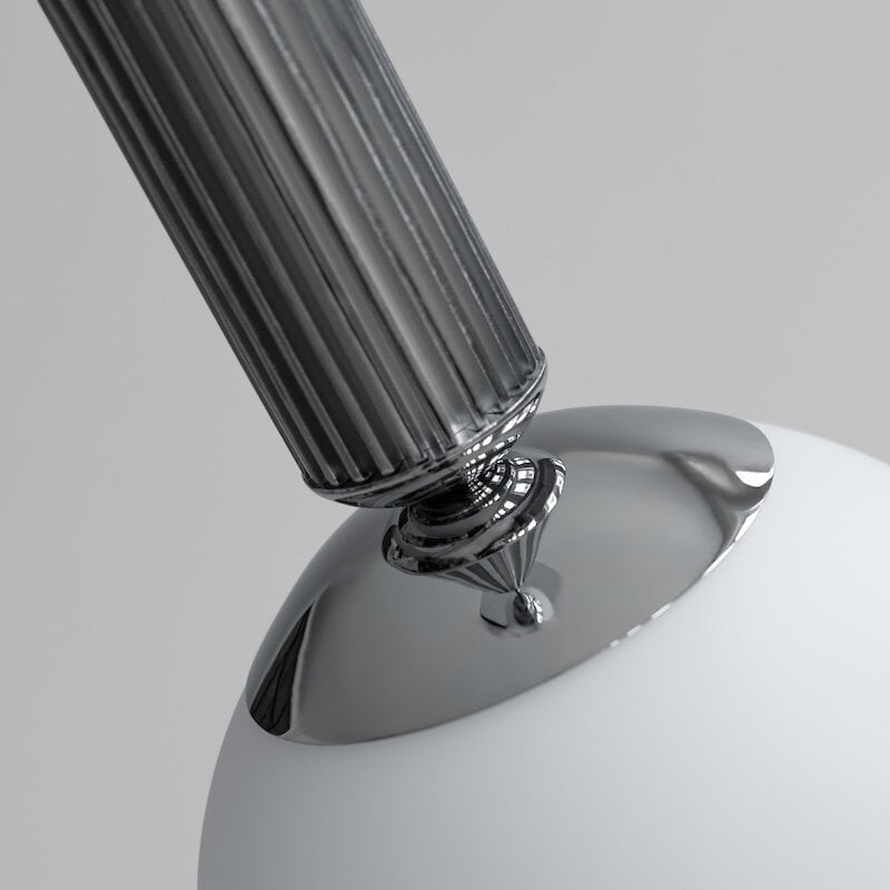 Den cirkulära skärmen i opalglas sprider ett mjukt och behagligt ljus som kompletterar de dekorativa detaljerna. Tillsammans skapar elementen en design som är både uttrycksfull och återhållsam – sofistikerad men lätt att integrera i olika miljöer.