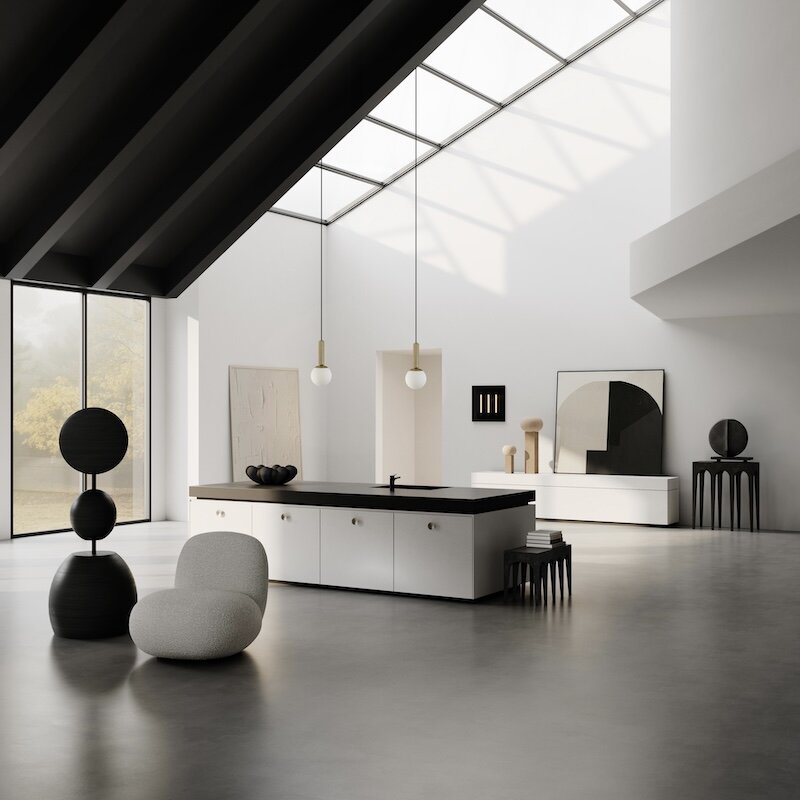 Den cirkulära skärmen i opalglas sprider ett mjukt och behagligt ljus som kompletterar de dekorativa detaljerna. Tillsammans skapar elementen en design som är både uttrycksfull och återhållsam – sofistikerad men lätt att integrera i olika miljöer.