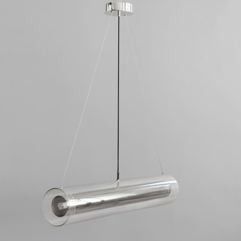 Balansen mellan skärpa och mjukhet är central för kollektionens visuella identitet. Dold bakom lagren av perforerad metall och klart glas ligger den integrerade LED-ljuskällan, inkapslad i ett vitt akrylrör. Denna dolda kärna sprider ljuset jämnt och skapar ett varmt, mjukt sken som förstärker djupet och karaktären i den lagerbyggda konstruktionen.