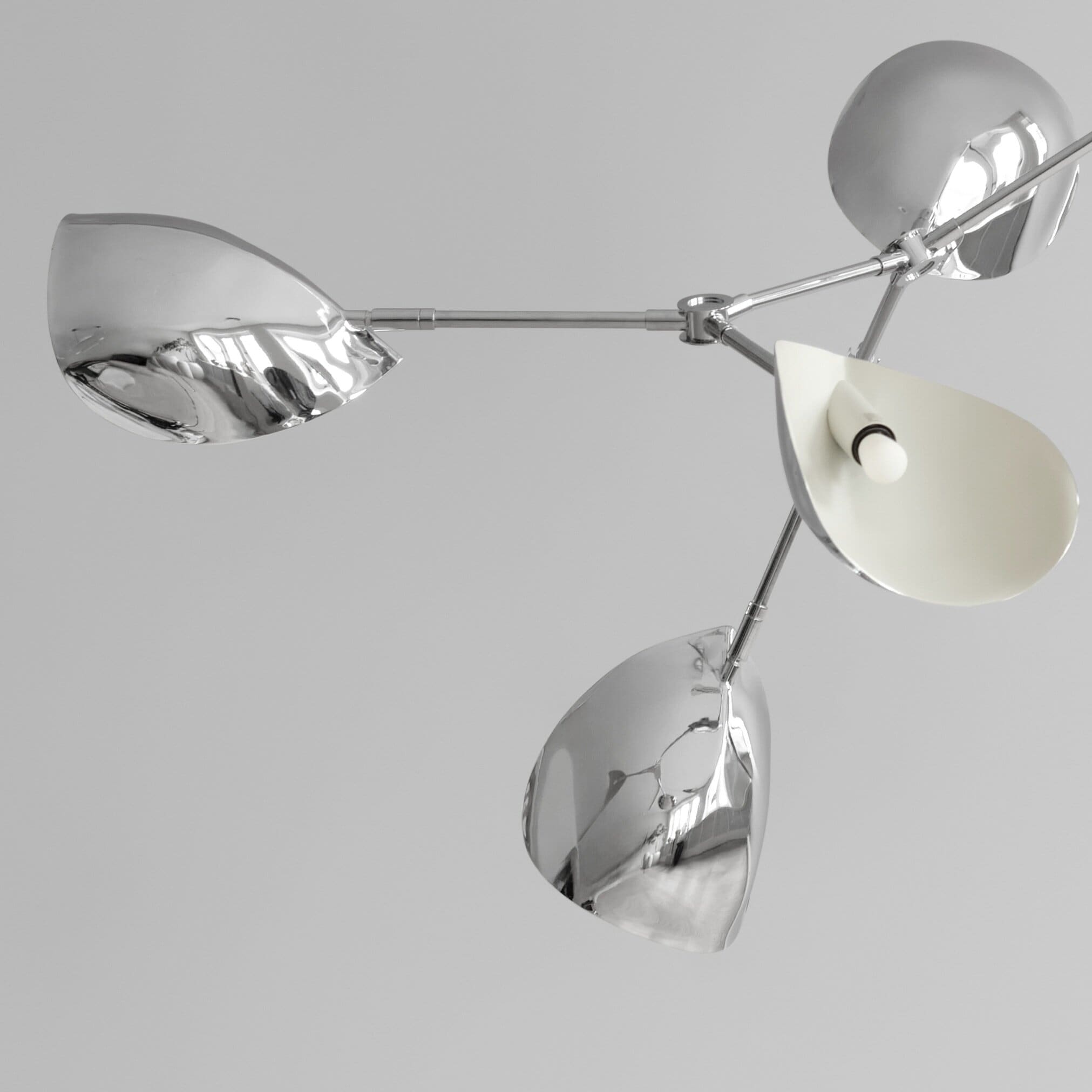 Med sin finish i polerad krom reflekterar ljuskronan omgivningen med spegellik klarhet och tillför både briljans och sofistikerad lyster till interiören. Upphängd i en justerbar arm svävar lampskärmen i perfekt balans, motviktad av en elegant sfär – ett konstnärligt uttryck för kontrast, jämvikt och viktlöshet.
