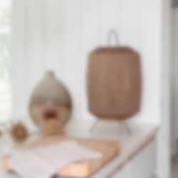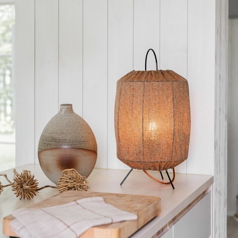 En lättplacerad lampa som fungerar lika bra som bordslampa som golvlampa. Den flexibla utformningen gör den enkel att anpassa efter olika rum och behov. Tyget är melerat i två färgtoner, vilket ger ett levande och mjukt uttryck. Trots att materialet är något kraftigare har det ett fint ljusgenomsläpp som skapar en behaglig och stämningsfull belysning.