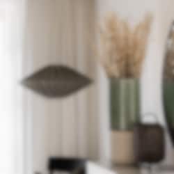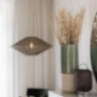 Taklampskärmen Figo har en stram form där tyget veckar sig mjukt. Tyget är polyester men har en fin "linne-look". Metallstommen är guldlackad. Kombineras med valfritt takupphäng.