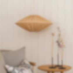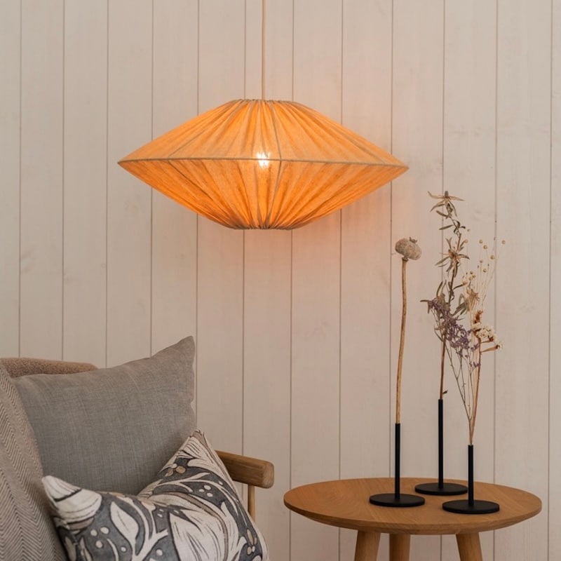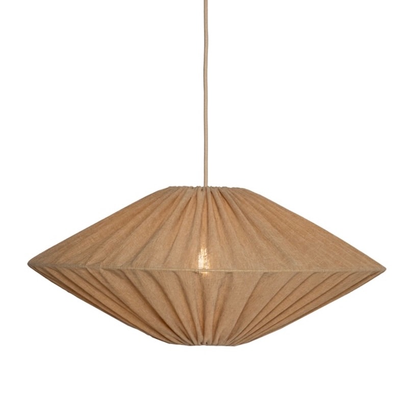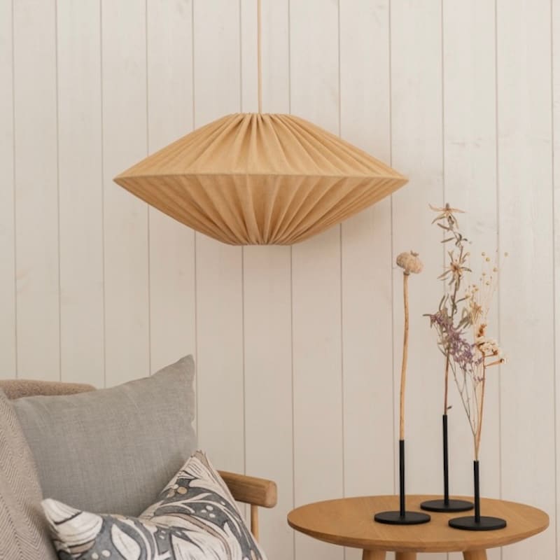 Taklampskärmen Figo kombinerar en stram och tydlig form med ett mjukt veckat textiluttryck. Tyget är tillverkat i polyester men har en naturlig linnekänsla som ger ytan struktur och värme. Den veckade textilen skapar ett levande ljusspel när lampan är tänd och bidrar till en behaglig och ombonad atmosfär. Den invändiga metallstommen är guldlackad och ger en diskret kontrast samt en stabil konstruktion. Figo kombineras med valfritt takupphäng och fungerar lika väl över ett matbord som i vardagsrum eller sovrum, där den tillför både form och stämningsfull belysning.