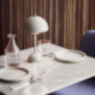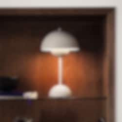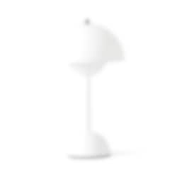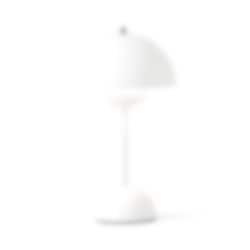 Den portabla modellen VP9 i matt vit är något lättare och mindre i storlek än den vanliga bordslampan. Den är utrustad med en USB-laddningskabel och finns i ett brett utbud av härliga färger som skapar en spännande atmosfär i inomhus- och utomhusmiljöer. Laddningstiden är 8 timmar för full laddning och batteriet kan bytas ut. Lampan har tre ljusstyrkor, 100%, 50% och 20%, batteritid vid 100% är 10 timmar.