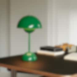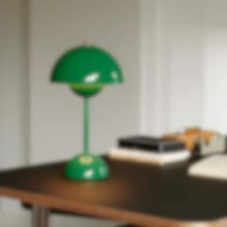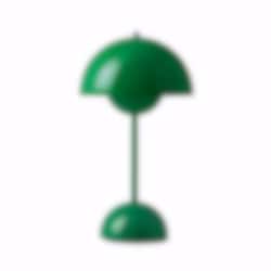 Den portabla modellen VP9 i signalgrön är något lättare och mindre i storlek än den vanliga bordslampan. Den är utrustad med en USB-laddningskabel och finns i ett brett utbud av härliga färger som skapar en spännande atmosfär i inomhus- och utomhusmiljöer. Laddningstiden är 8 timmar för full laddning och batteriet kan bytas ut. Lampan har tre ljusstyrkor, 100%, 50% och 20%, batteritid vid 100% är 10 timmar.